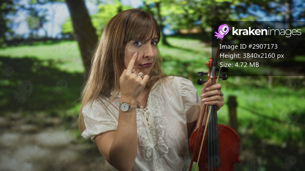 Woman points finger to cheek while holding violin and bow in a sunlit forest scene; playful curiosity.