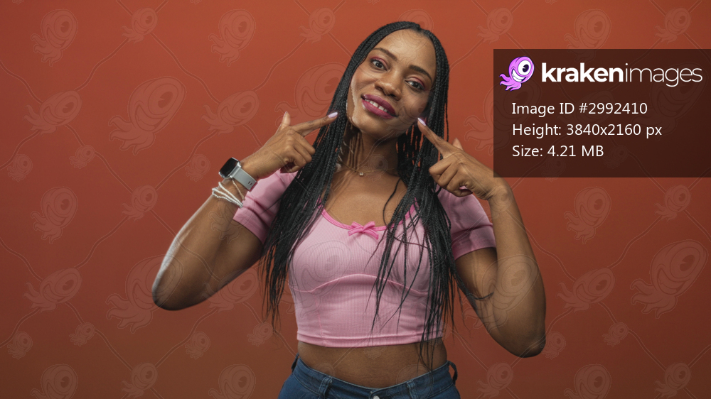 Woman points finger to cheeks while smiling, wearing pink crop top and smartwatch in studio; joyful confidence playfulness.