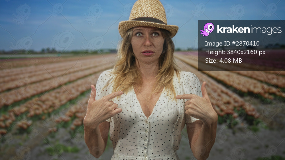 Woman points finger to chest among long rows of tulip flowers and green beds in studio; surprise self reflection.