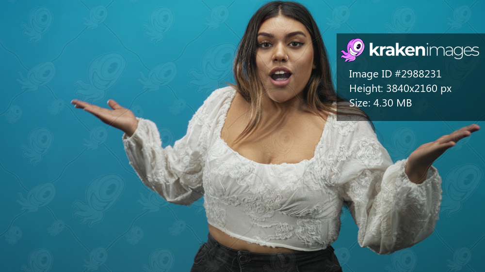 Woman points finger to chest and gestures shrug with open hands in studio; surprise self questioning.