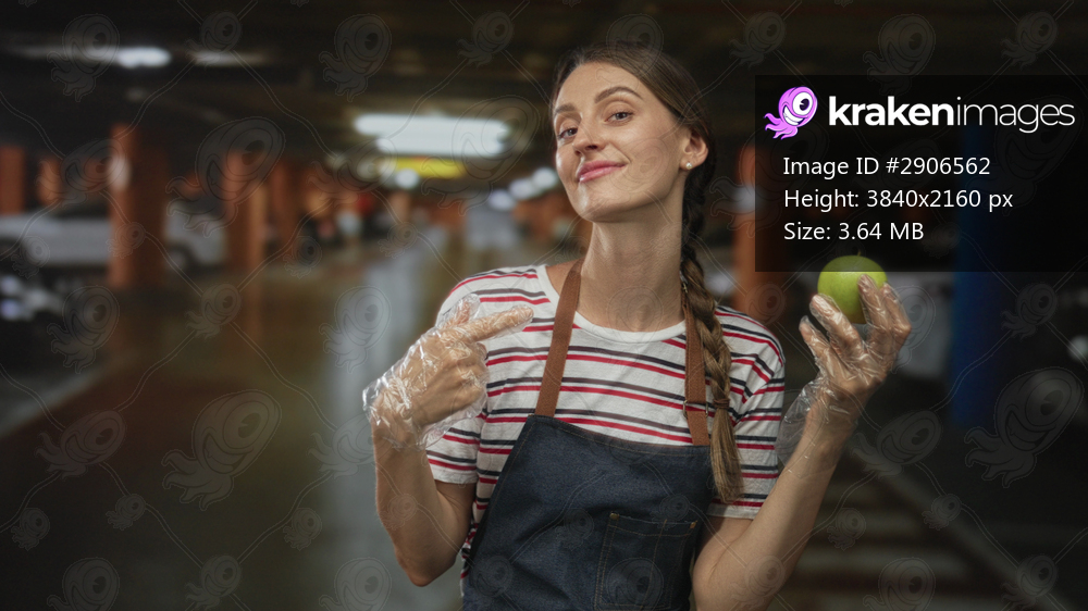 Woman points finger to chest holding green apple with clear plastic gloves in parking building under fluorescent lights; confidence food safety.