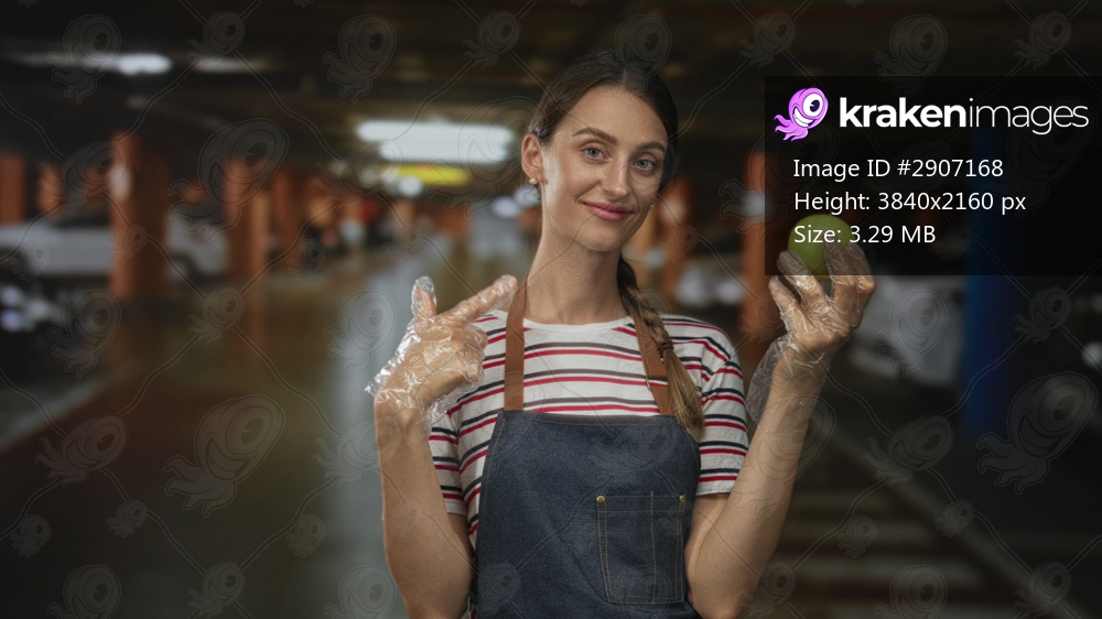 Woman points finger to chest holding green apple with clear plastic gloves in parking building under fluorescent lights; confidence food safety.