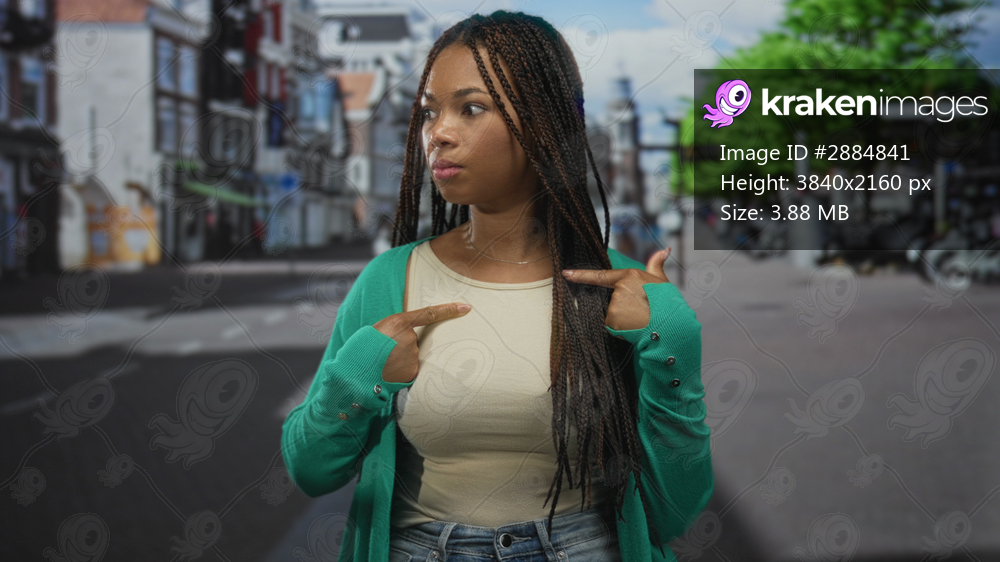 Woman points finger to chest on street, braided hair, green cardigan and tank top; self assertion pride.