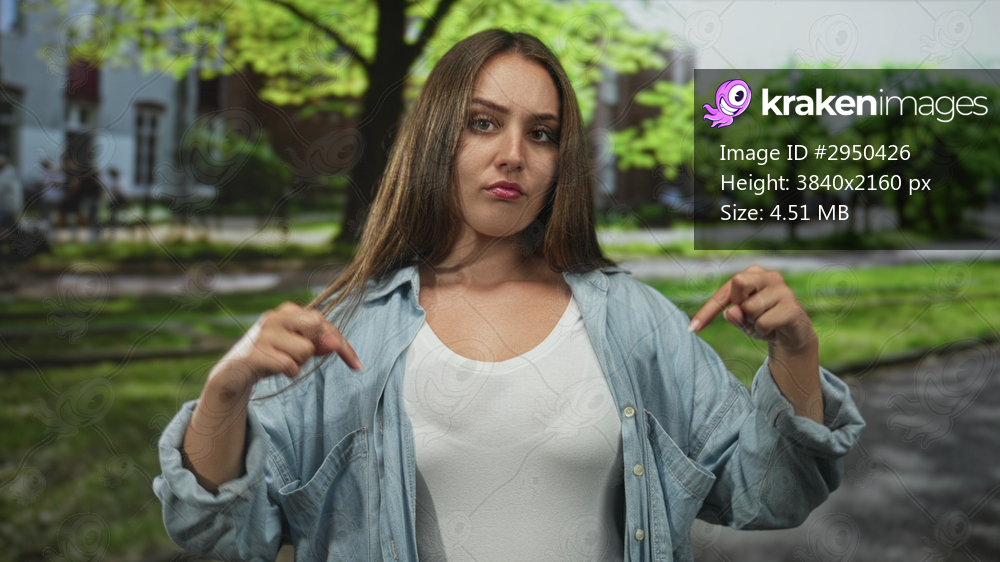 Woman points finger to chest outside building in park wearing white tank and denim shirt; self confidence.