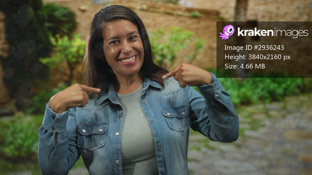Woman points finger to chest while tugging a denim jacket in a stone courtyard by a building, smiling broadly; confidence.