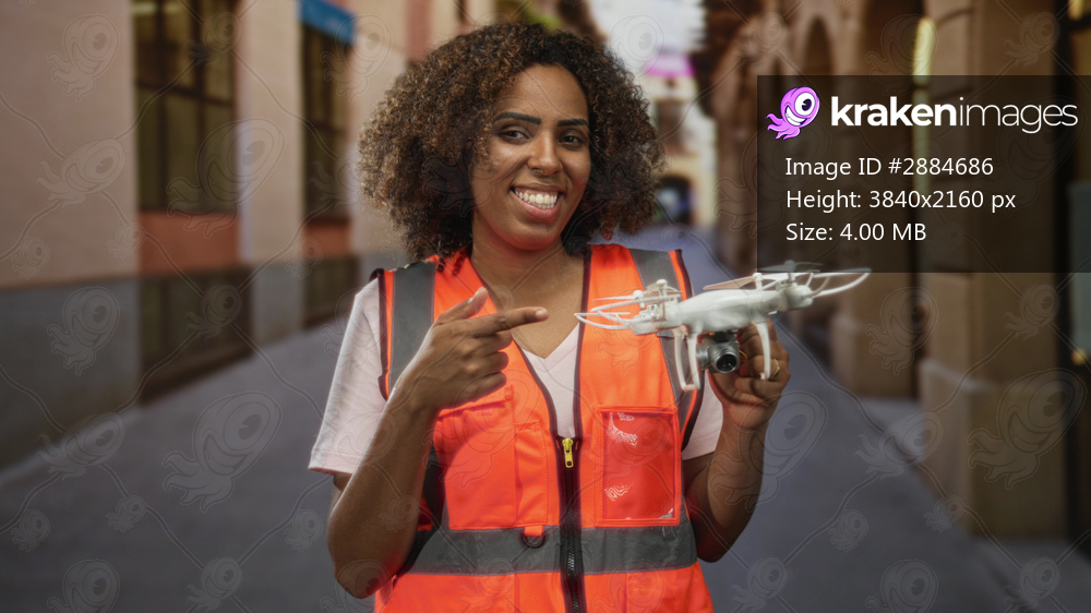 Woman points finger to drone in old town street wearing orange safety vest and holding camera quadcopter, smiling; skill confidence.