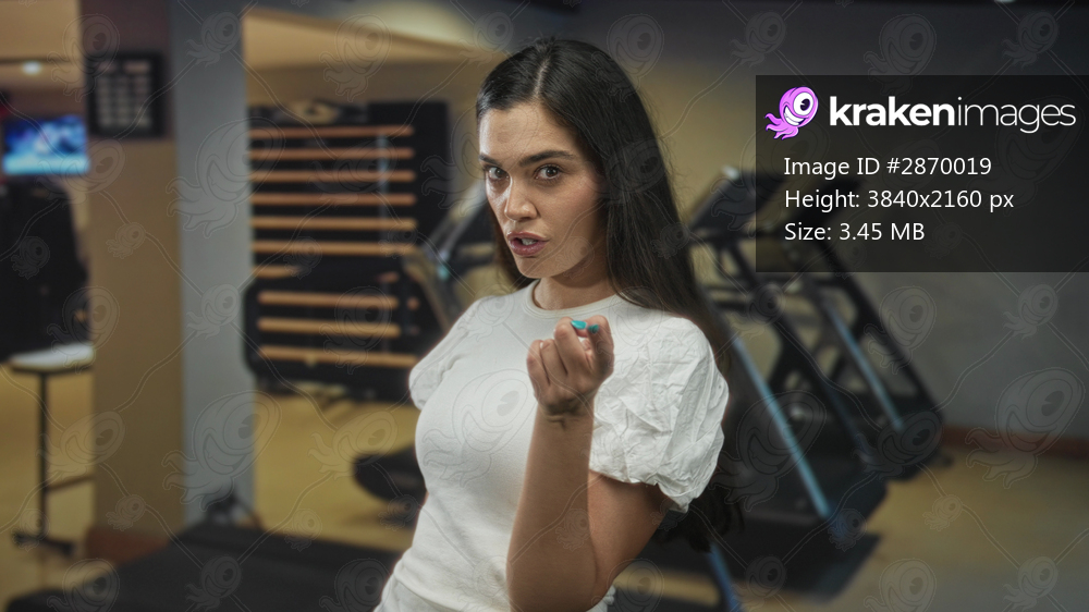 Woman points finger to eye in gym with a stern watchful gaze and direct pointing gesture toward camera; vigilance.