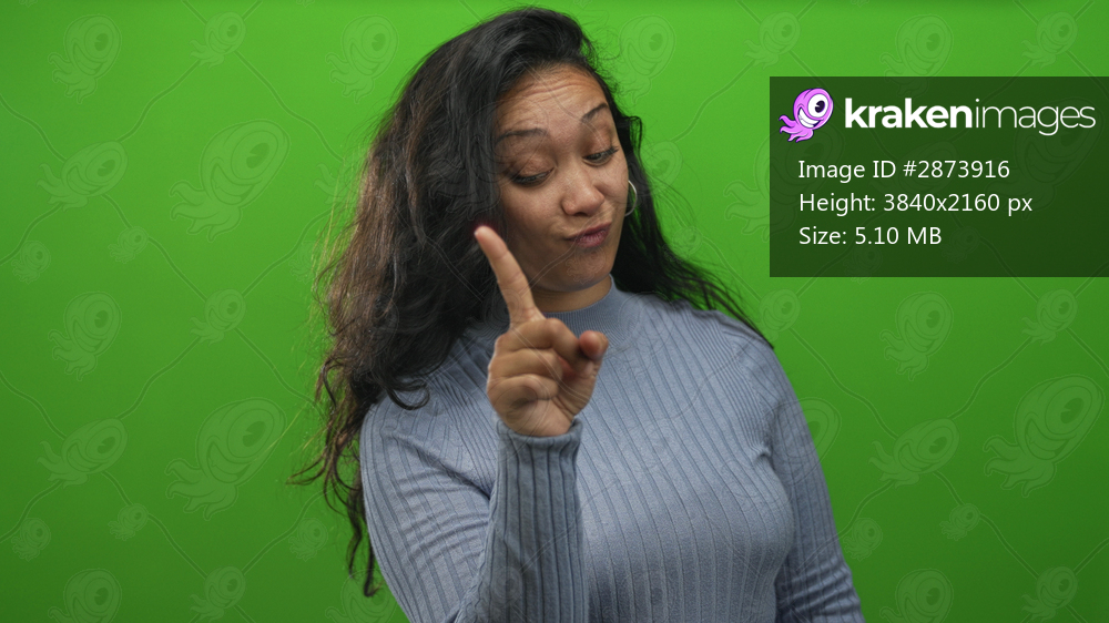 Woman points finger to eye in studio green screen, smirk with raised eyebrow and casual sweater; playful curiosity.