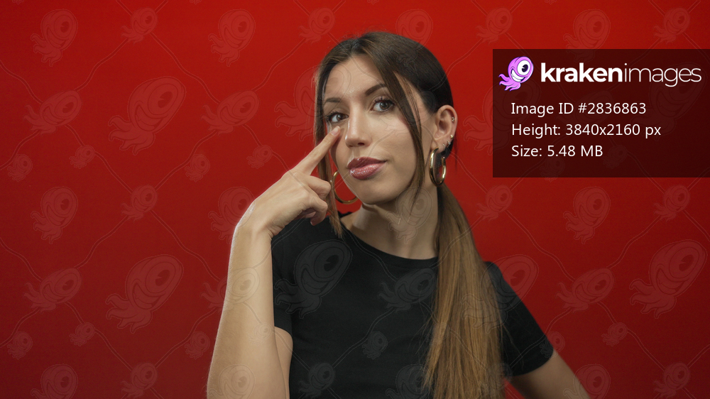 Woman points finger to eye in studio with red backdrop wearing hoop earrings and black top; focus clarity.
