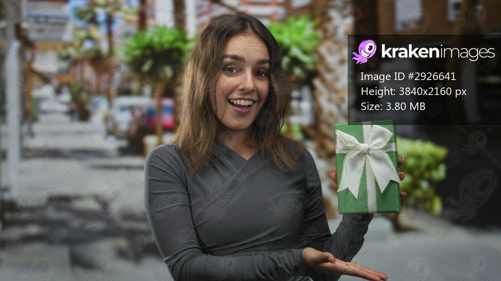 Woman points finger to green gift box on street near palm trees and blurred storefronts; surprise reveal.