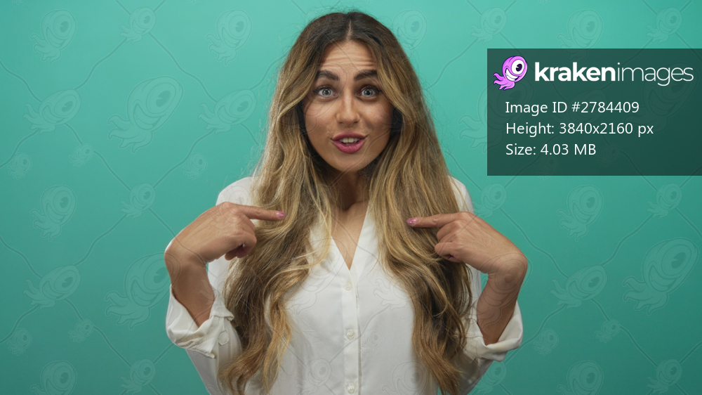Woman points finger to hair in studio; confidence playfulness.