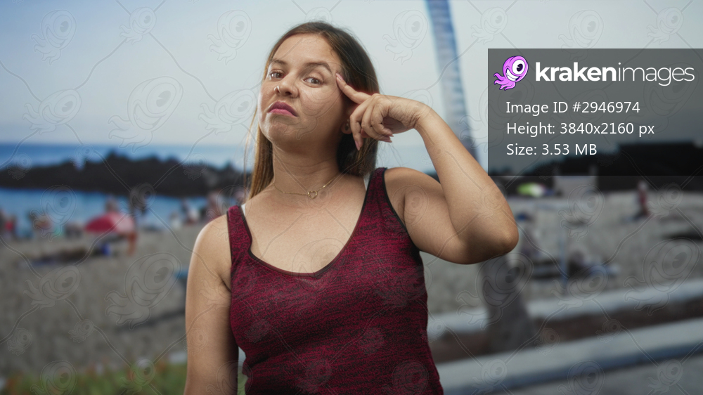 Woman points finger to head on street beside a crowded beach promenade, wearing burgundy tanktop and heart pendant necklace, direct gaze; thinking idea. - Kraken Images