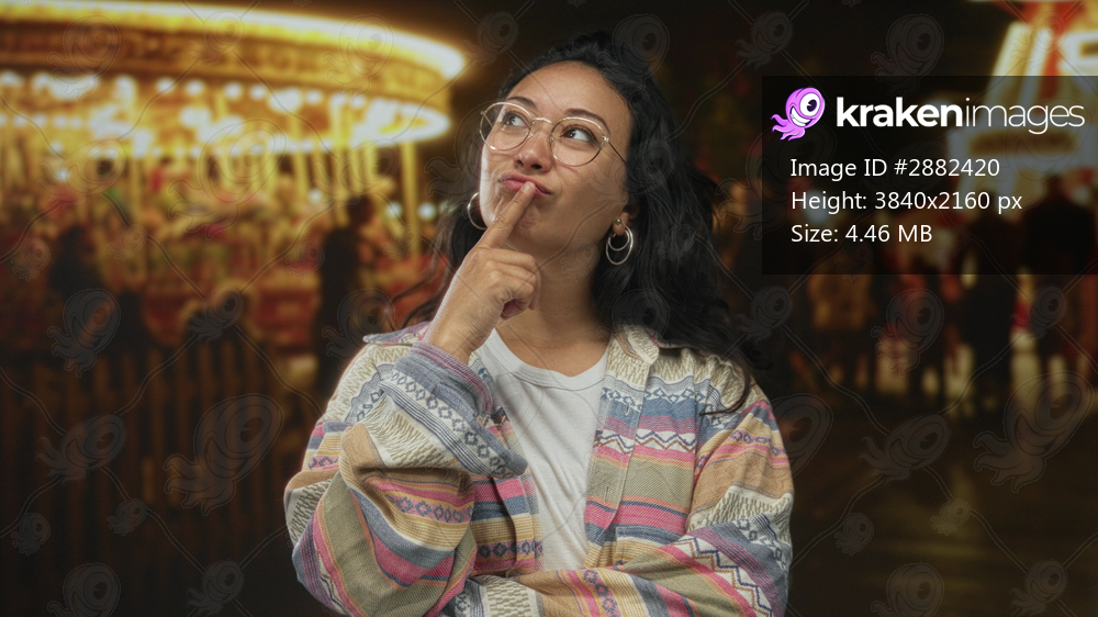 Woman points finger to head on street near fair carousel at night, smiling with glasses and patterned cardigan; curiosity joy.