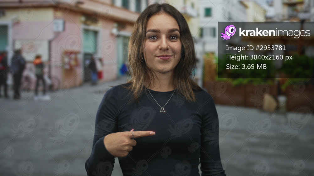 Woman points finger to heart necklace on street wearing black long sleeve shirt and smiling slightly; confidence approval.