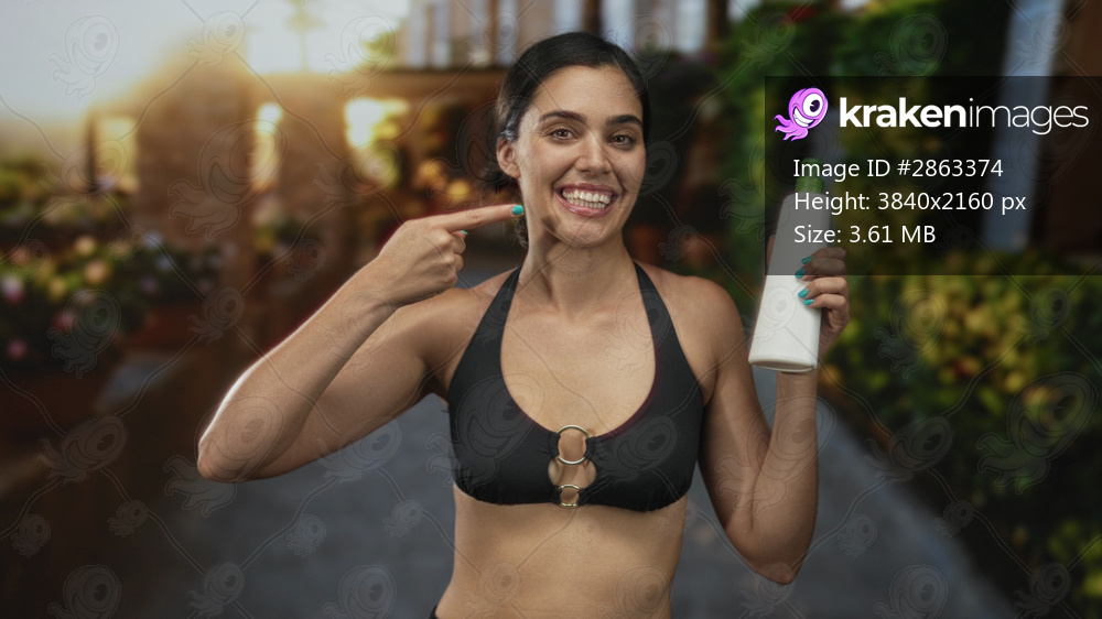 Woman points finger to lotion bottle while smiling in a sunlit street wearing black bikini top and holding the bottle; skincare joy.