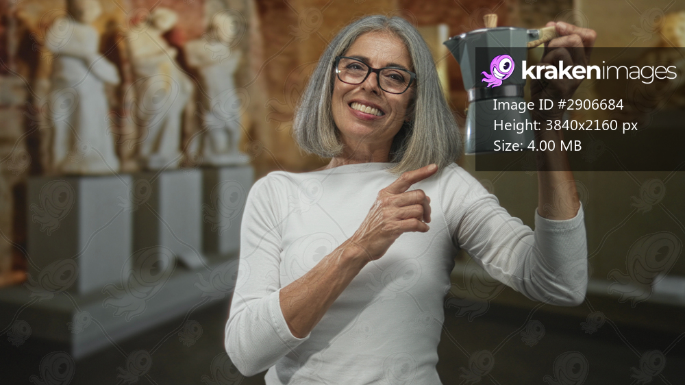 Woman points finger to moka pot while holding it in a building gallery surrounded by sculptures; nostalgia joy.
