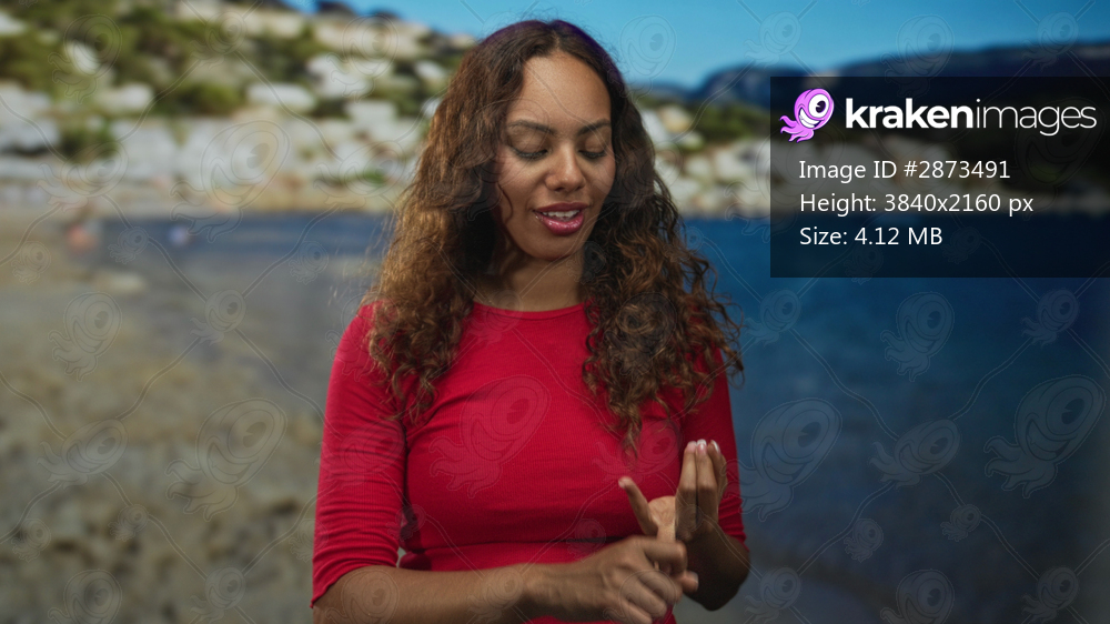 Woman points finger to nails on beach, wearing red top and curly hair, hands visible while counting fingers by the seaside; serenity.