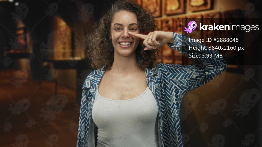 Woman points finger to nose beside framed paintings in an art gallery building while smiling and wearing a white tank top and patterned shirt; playful. - Kraken Images