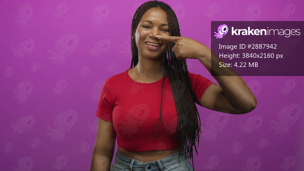 Woman points finger to nose in purple studio wearing red crop top and jeans, smiling to camera; playful confidence.
