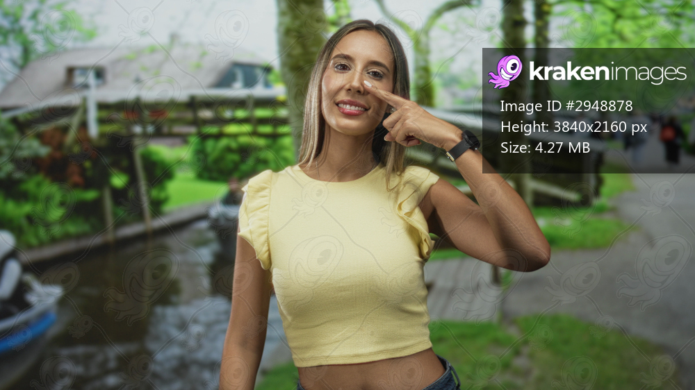 Woman points finger to nose on street beside amsterdam canal and water, wearing crop top revealing navel; playful curiosity.