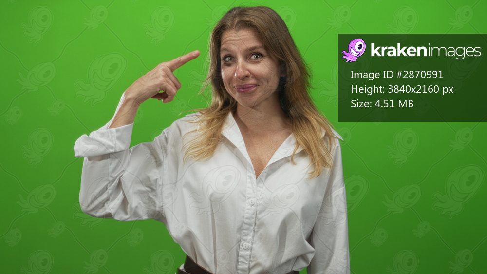 Woman points finger to nose and points to temple in studio with bright green screen; playful curiosity.
