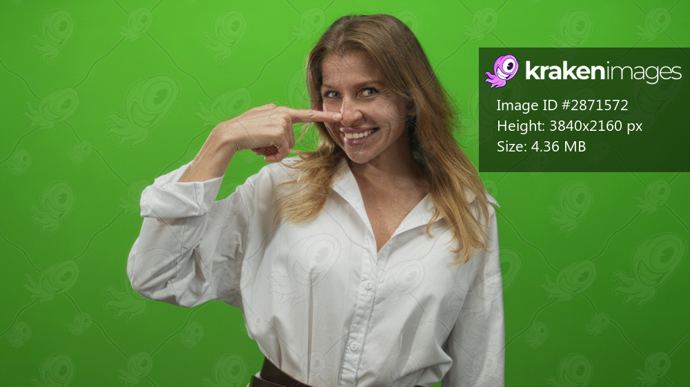 Woman points finger to nose and points to temple in studio with bright green screen; playful curiosity.