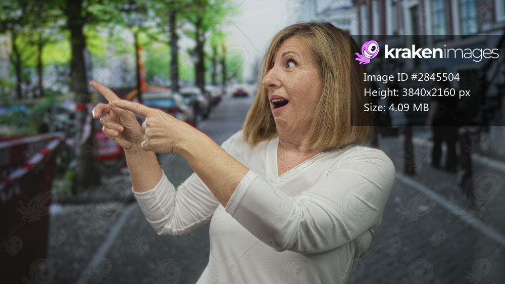 Woman points finger to object on street lined with trees, parked cars, and bicycles on sidewalk; curiosity.