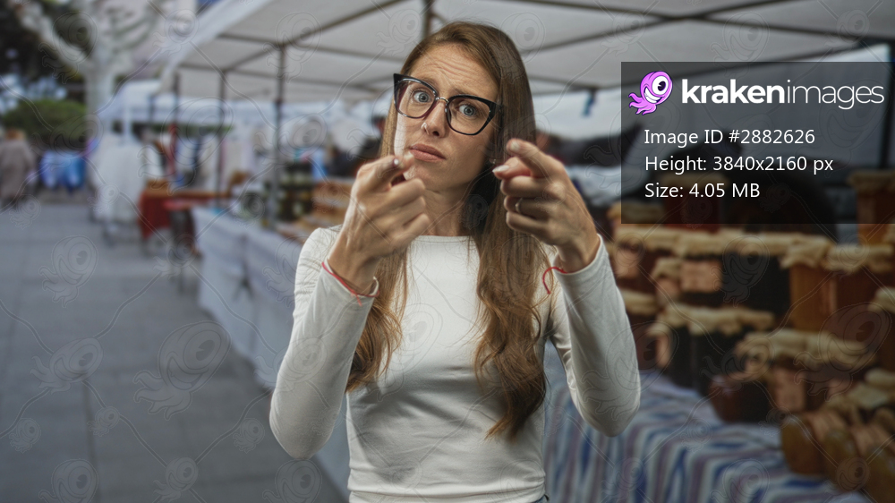Woman points finger to open palm at street market stalls while offering empty hand and pointing gesture; skepticism asking.