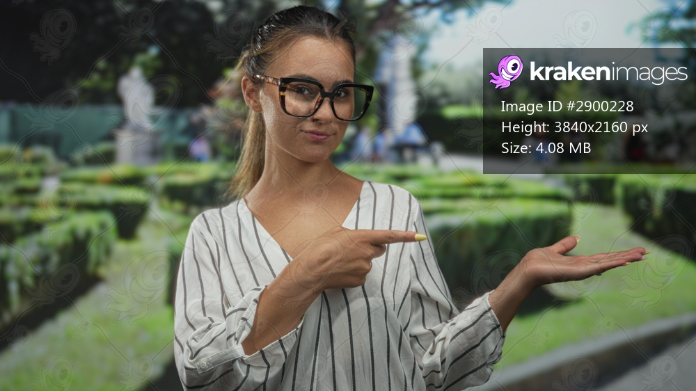 Woman points finger to open palm in a green park pathway with hedges and statue; casual invitation confidence.