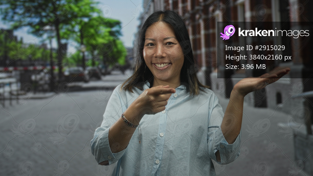 Woman points finger to open palm on city street while smiling and looking at hand; friendly invitation.
