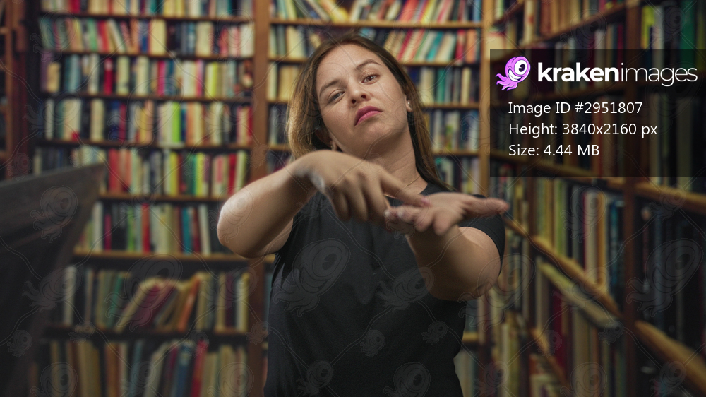 Woman points finger to palm in library aisle showing open hand and focused gesture; annoyance request.