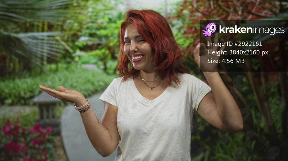 Woman points finger to palm and makes ok sign in forest pathway by a garden lantern, bare hands visible and smiling with closed eyes; joy playfulness.
