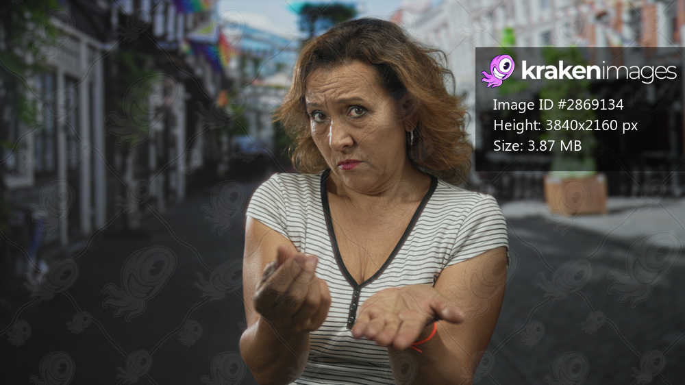 Woman points finger to palm showing empty hand asking for money on a city street lined with shops and rainbow flags; pleading need.