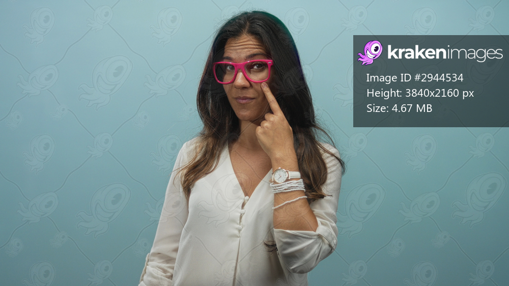 Woman points finger to pink glasses and touches cheek in studio with light blue backdrop and white blouse; skepticism questioning analysis.