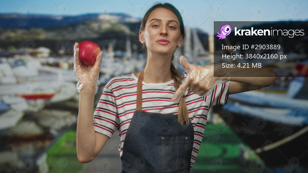 Woman points finger to red apple at port pier near moored boats wearing striped shirt denim apron and clear plastic gloves; cheerful.