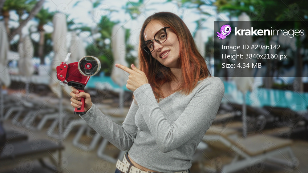 Woman points finger to red tape dispenser by resort poolside, smiling and wearing glasses; cheerful promotion.