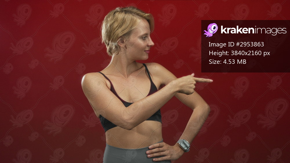 Woman points finger to right with hand on hip in studio, wearing black sports bra and grey leggings, smartwatch visible, smiling with closed eyes; confidence motivation. - Kraken Images