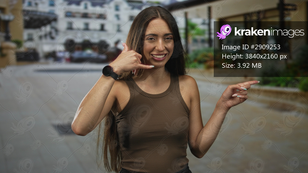 Woman points finger to right on city street while making call gesture and smiling; friendly invitation.