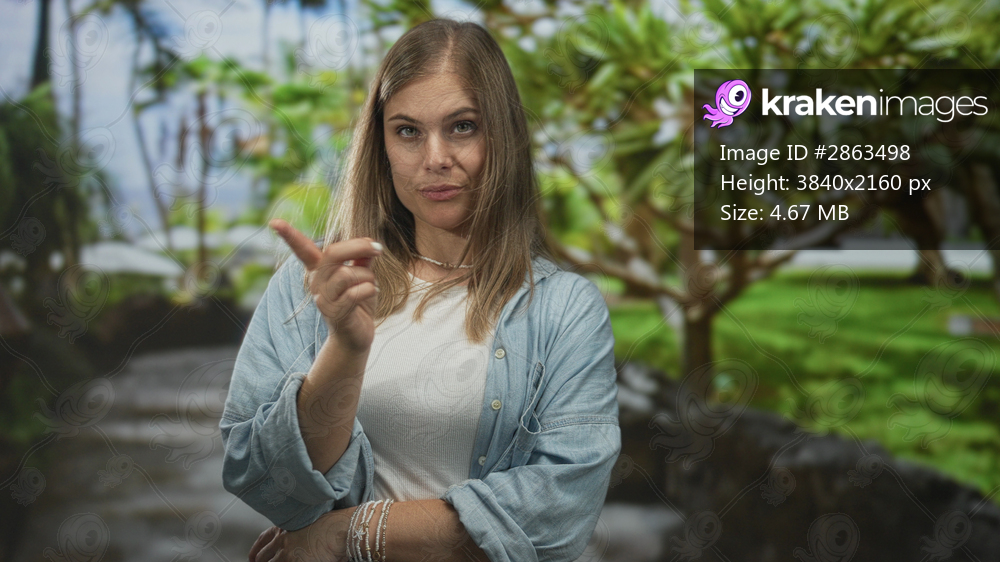 Woman points finger to self in forest path, outdoors green park setting with stern expression; personal denial.