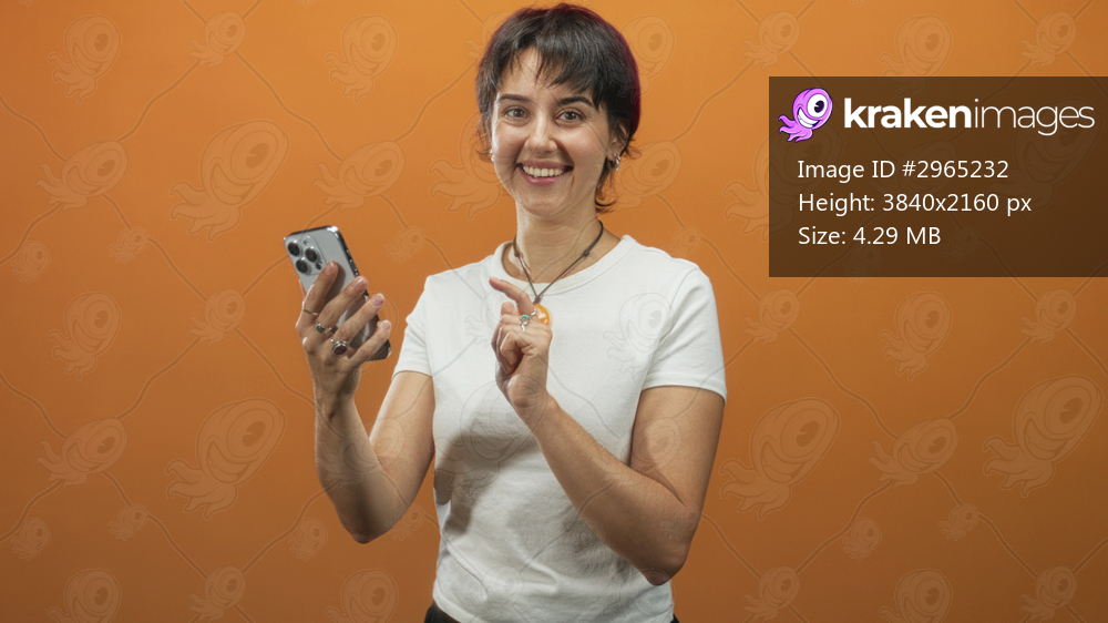 Woman points finger to smartphone in studio, smiling and tapping screen while holding phone with left hand and wearing orange pendant; joyful connection. - Kraken Images