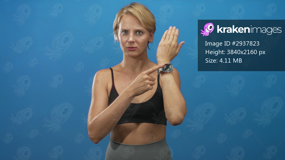 Woman points finger to smartwatch on bare wrist while raising arm and inspecting watch face in studio; time concern.