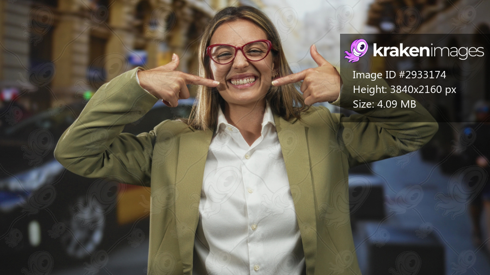 Woman points finger to teeth on street in city center wearing red glasses and green blazer, smiling broadly; joy confidence.