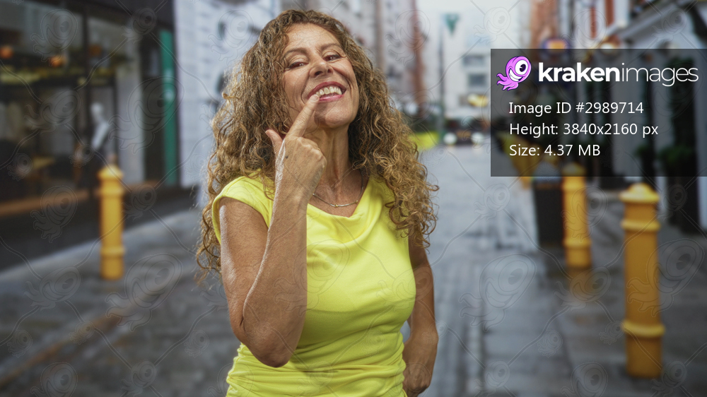Woman points finger to teeth while smiling broadly in a yellow top on a wet narrow cobblestone street; confidence celebration.