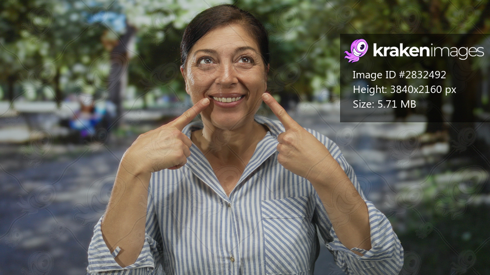 Woman points finger to teeth while smiling on green park walkway lined with trees under dappled sunlight; happiness.