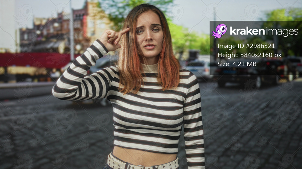 Woman points finger to temple with a skeptical squint, striped crop top and belt showing a small bare waist, standing on a cobblestone street with parked cars; uncertainty thinking. - Kraken Images