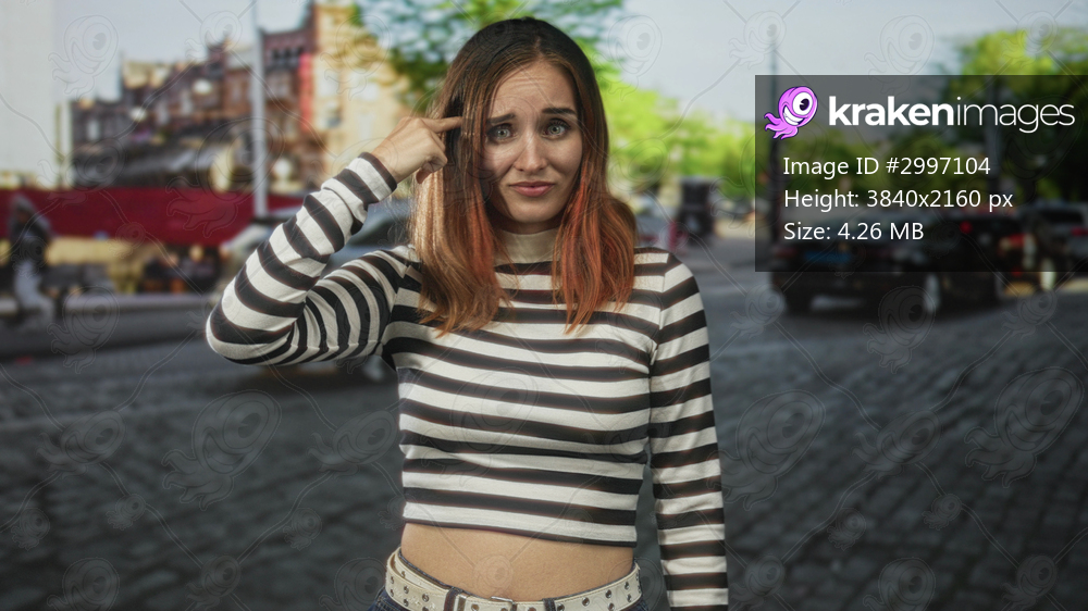 Woman points finger to temple with a skeptical squint, striped crop top and belt showing a small bare waist, standing on a cobblestone street with parked cars; uncertainty thinking. - Kraken Images