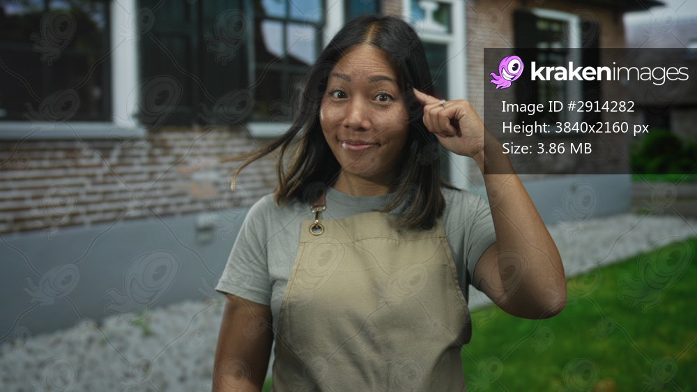 Woman points finger to temple at a brick building entrance wearing beige apron and grey tee, smiling with ring on finger; thoughtful idea insight.
