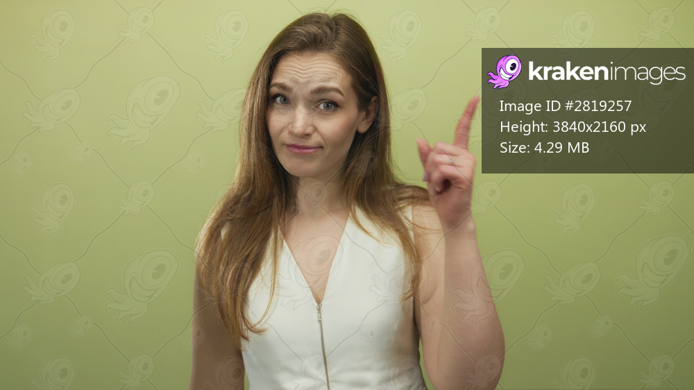 Woman points finger to temple in a green studio while wearing a white sleeveless top and tilting head; uncertainty doubt introspection.