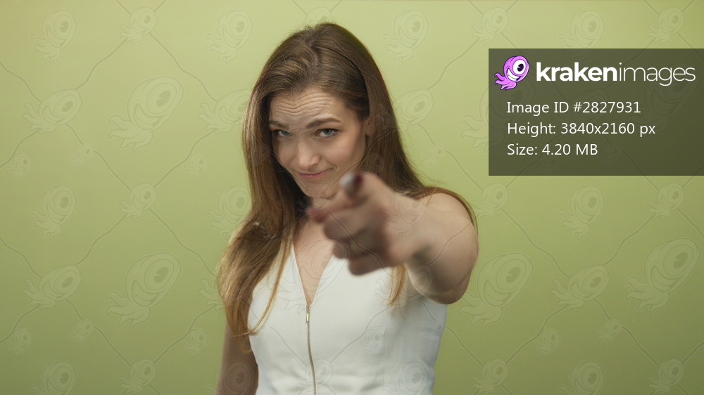 Woman points finger to temple in a green studio while wearing a white sleeveless top and tilting head; uncertainty doubt introspection.