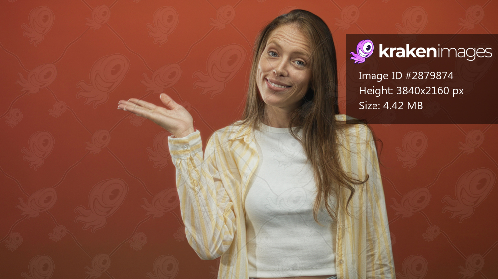 Woman points finger to temple in orange studio while smiling subtly, wearing white crop top and striped shirt; thinking doubt.
